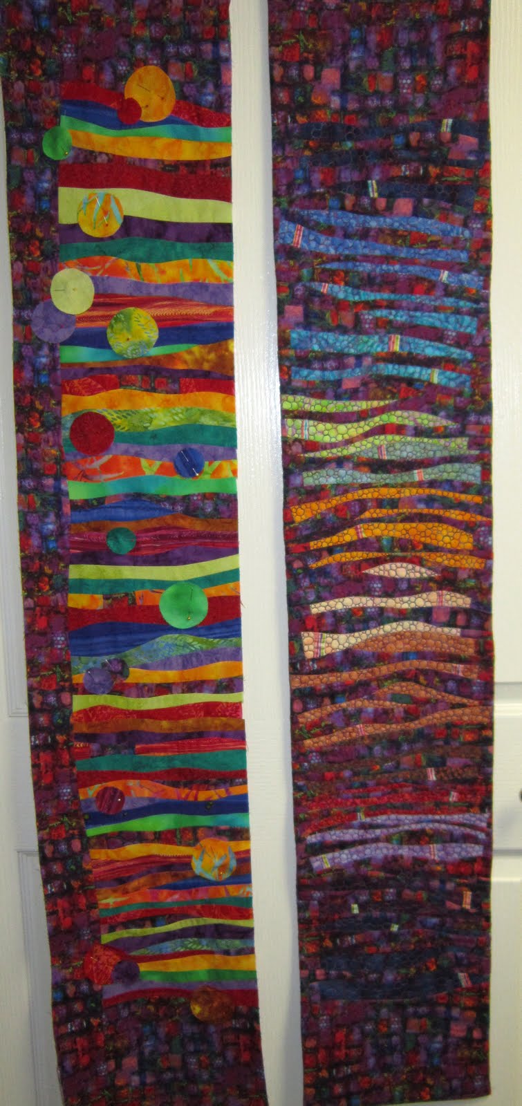 The first photograph are the two gifts I created for two of my quilting friends. The two women I went on the quilt run with in February and I purchased fabric at each store we visited and then divided the fabric between the three of us. We were each to make a wall hanging that measured 10 x 55 from the fabric we received and then we would present them to one another at our Winter Solstice Party. The two hangings below are the two wall hangings I received from my friends. I think they are just beautiful. So different from each other but incredible together! I will also make one for myself so the Three of them can hang together.